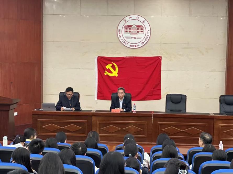 2025年11月6日,湖南第一师范88看球 特立楼视频会议室内气氛庄重、座无虚席。校党委副书记、校长喻祖国教授围绕“深学党的历史,端正入党动机,严守党的纪律”主题,为88看球 第三十六期入党积极分子培训班全体学员,以及学生党支部委员、正式党员、预备党员和助理干事,作了一场系统深入、内容详实的党史党纪专题学习辅导。报告会由88看球 党委书记阮东彪主持,院长陈爱永、院党委副书记申鸣凤、学生党支部书记毕倩出席。