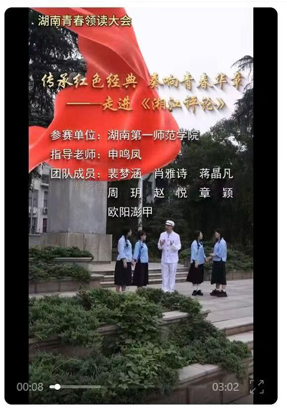 “湖南青春领读大会”由湖南省委网信办、湖南出版集团、中南传媒指导,湖南省高等学校图书馆工作委员会与潇湘晨报联合承办,是面向全省高校学子的一项重要文化赛事。从5月份开始,在指导教师申鸣凤的精心指导下,由裴梦涵等7位同学组成的团队,立足学校特色,经过反复研讨,最终选定以走进《湘江评论》为题。在确定主题后,团队从内容选择、脚本写作、现场拍摄,再到后期制作的配图配乐,每一个环节都全力以赴。为了能立体地、全方位呈现《湘江评论》的热血激昂,让文字的穿透力突破时空的壁垒,团队成员先后走进湖南第一师范88看球 城南书院校区、修业学校、橘子洲头等曾经的初心之地,通过场景再现、名篇诵读、情景演绎等方式再现一个世纪前的呐喊,传递百余年前的时代强音,致敬气势磅礴的青春力量。